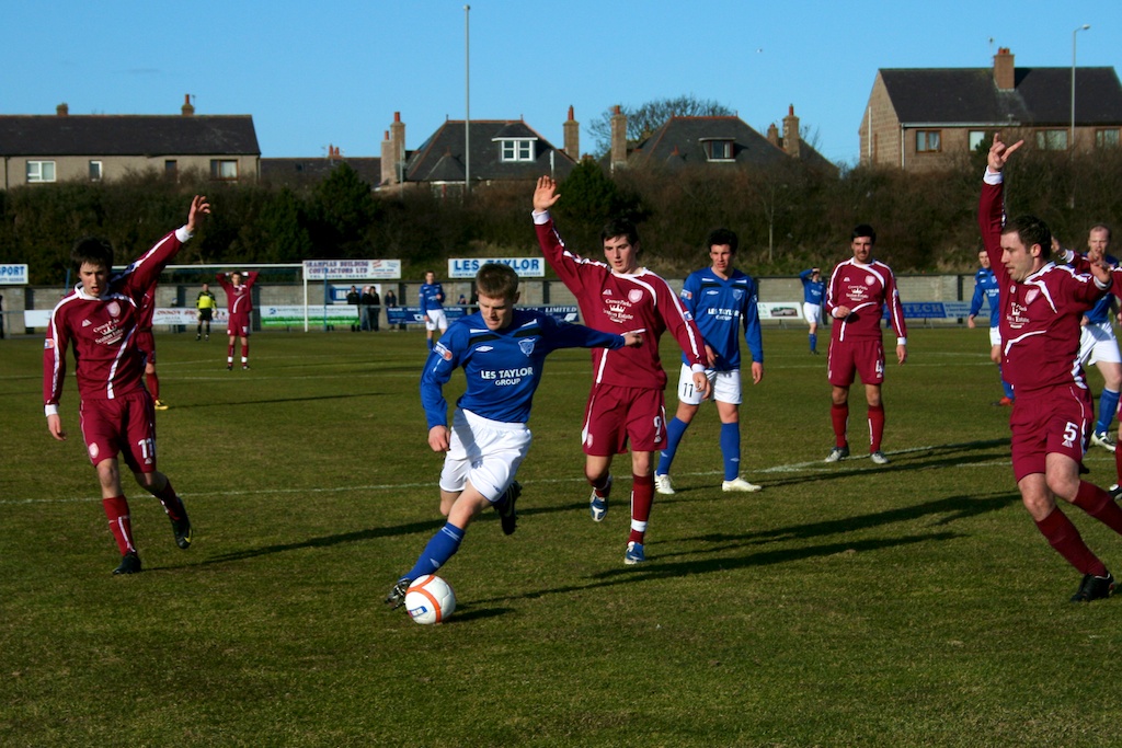 The four hour drive went reasonably quickly although I did experience an odd moment when we stopped off at a Perth petrol station and several dozen Celtic fans were there heading in the opposite direction to Glasgow – an almost symbolic moment of the current feelings I have for my team. There was a slight directional mishap on arrival in Aberdeen when Kieran’s trusty iPhone suggested a short cut which had us going round the one way system of the city centre before he got us back on track. However we still managed to arrive at Peterhead with an hour to spare before kick-off. The town is hardly the most welcoming with a huge power plant and a supply depot along with the prison dominating the area; but past that is the more aesthetically pleasing expansive harbour and marina.