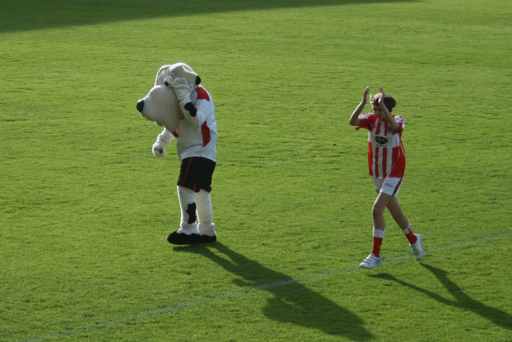 Through the turnstile we entered an area reminiscent of a nuclear fall out shelter - grey concrete, low roofs and dull fluorescent lighting. However a quick walk up the stairs brought us back into the sunshine and into an impressive little arena with all seater stands occupying 3 sides and views of the distant hills peeking through the corners. After a satisfying pie and Bovril and a quick scour through the programme the teams, along with the surliest mascot we've witnessed thus far, emerged to a disappointingly small crowd.