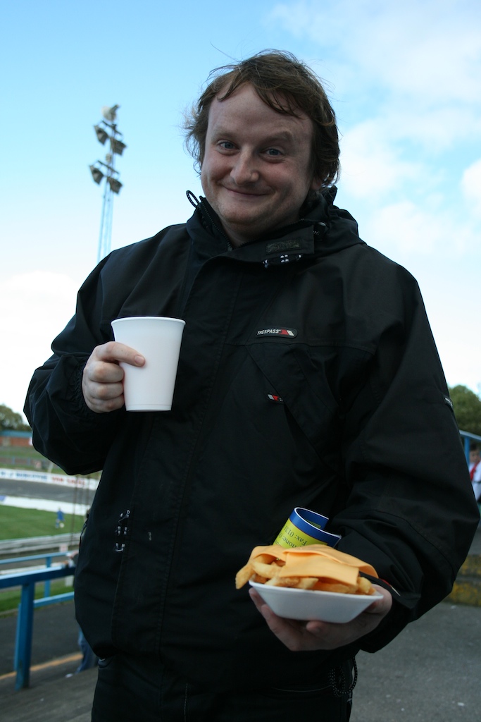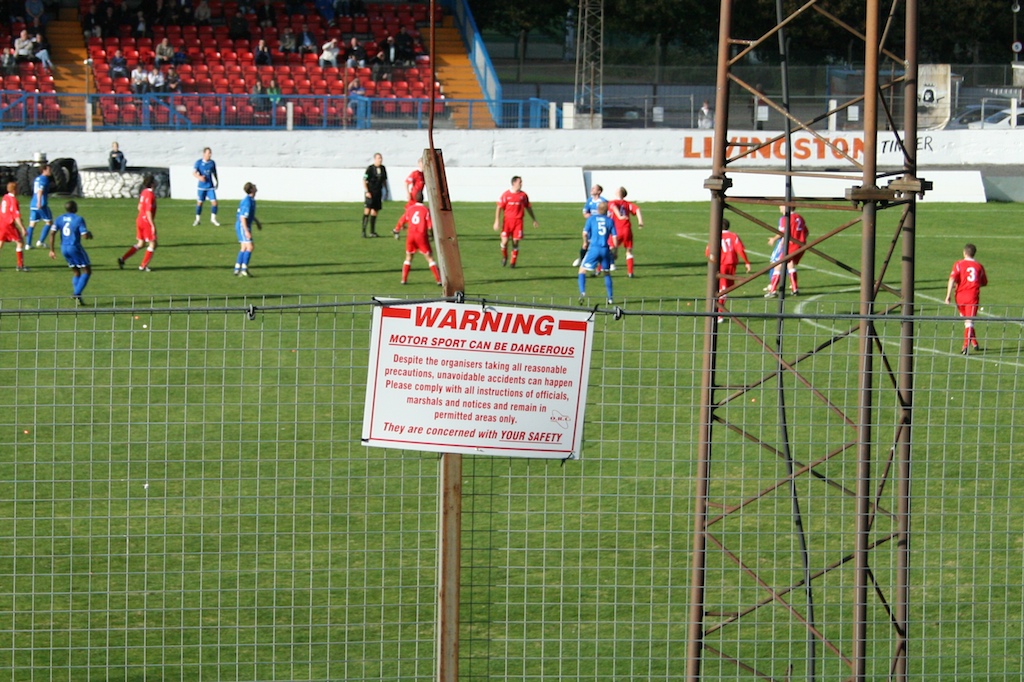 After a fairly bland journey up the M8 (improved somewhat by sharing a car with two St Mirren fans as Celtic defeated them) we arrived in Cowdenbeath around half two. Our immediate impressions weren't exactly positive but the sun had broke out yet again as we squeezed our way through the narrow turnstiles and up the steps into the arena: to be greeted with a Union Jack fluttering proudly. However my disdain turned to disbelief at the sight of the stadium. Various countries flags were positioned over a racing track that stood between the terraces and the pitch with high fencing all around giving it some sort of quasi European look. As a result the pitch seemed a million miles away from where we were standing. The main stand seemed to be only half built with one section adorning new seats and the other just wooden benches. There were various Portakabins dotted around and we made our way to the only open one for our pie and Bovril.
