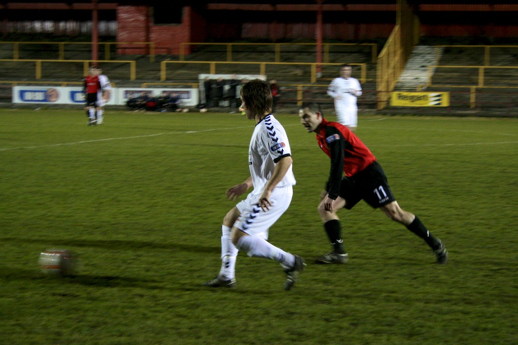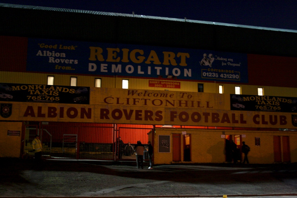 Albion Rovers v East Stirling on a cold Tuesday night is hardly the most appealing of fixtures but nonetheless was another page in the closing chapter of the Groundhopping journey. It was a short drive down the M8 to Coatbridge; a town of high-rise flats, run down shops and of course, Cliftonhill Stadium. Albion Rovers have played at the ground since Christmas day of 1919 and in truth it looks like it still has the original décor. The small main stand, despite being rather archaic, has an impressive set-up with a mixture of seating and terracing. On the opposite side is a disused bank of terracing and that’s about it in terms of the ground, behind one goal is high fencing and the other a field rolling down to a housing estate.