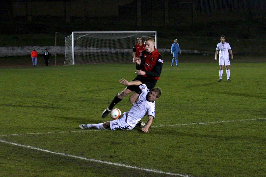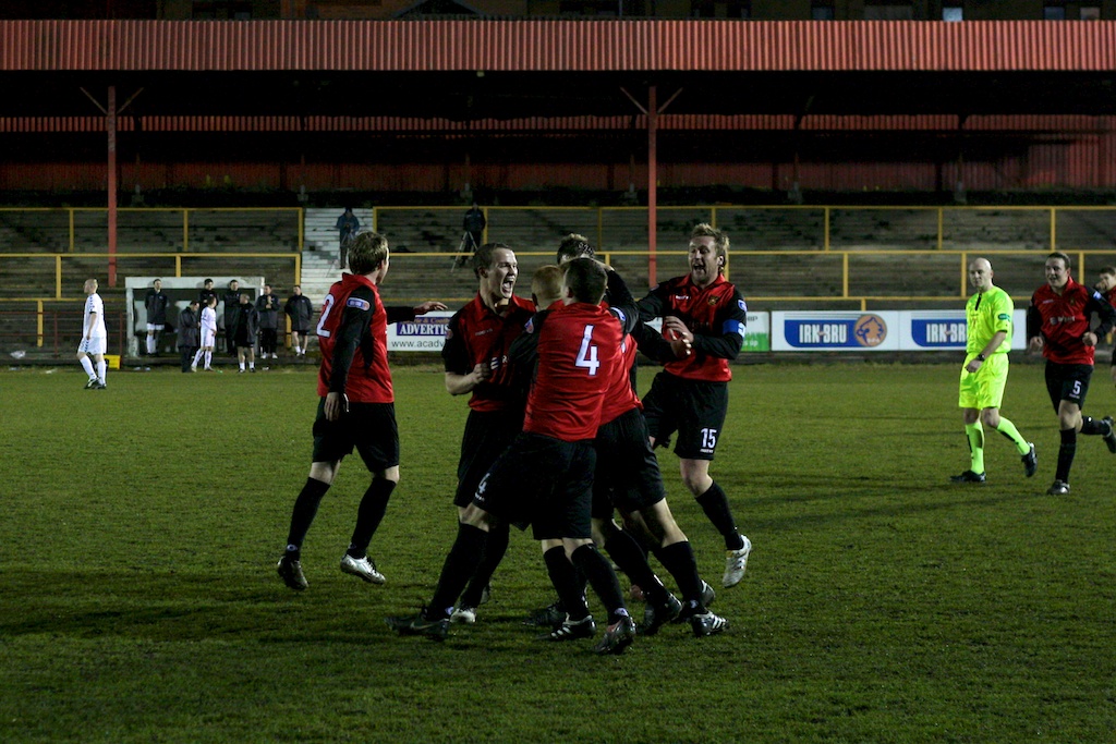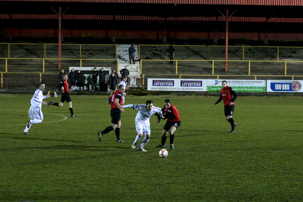 The keeper was to be undone just five minutes after the restart when an expertly placed looping header from Jamie Stevenson gave East Stirling the advantage. It lasted all of five minutes when Albion won a hotly disputed penalty to level matters. It was all too much for one East Stirling fan whose continuous barracking of the ref saw him being led out the ground by two stewards. Then Ewings once again proved his worth with a great tip around the post and this was followed by another slice of luck when East Stirling again hit the post.