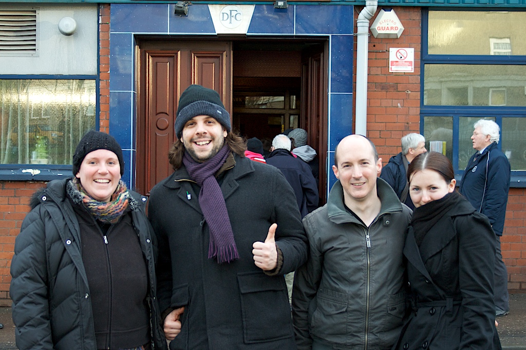 Day 2 of the Groundhoppers Gathering and despite one or two nursing slight hangovers the clan devoured some bacon butties, packed up their belongings and readied themselves for the first division clash between Dundee and Dunfermline. As we stood outside Dens Park Jamie dropped the bombshell that he was defying one of the founding rules of the Groundhoppers and would be taking his seat in the home end alongside Jim, Nicola and Emma (he claims he never agreed to this rule, I smell a bit of a glory hunter in him). With the splitters heading off into the bowels of the main stand, Kieran, Matt and I opted to join the Pars in the away end.