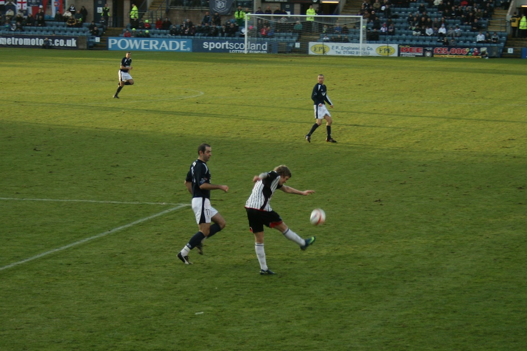Then came a moment of controversy off the park as the already over officious stewards proceeded to advise Kieran that he had to stop taking pictures whilst the game was in action. Granted it is within the SFA rules that he needs permission to do this but after visiting more illustrious grounds than Dens it was somewhat embarrassing that they couldn’t turn a blind eye on this occasion. However in a wonderful act of Groundhopping unity several Dunfermline fans behind us promptly held up their camera phones in unison – it was an ever so brief moment of sticking two fingers up to the man. He was allowed to take pictures again at half time by which point Dunfermline had found themselves behind again.