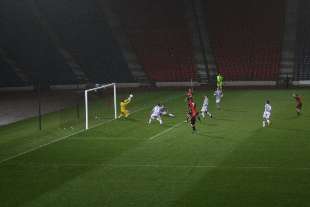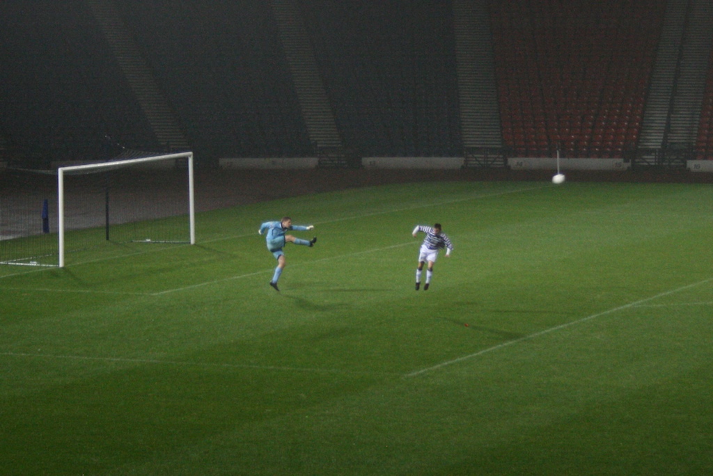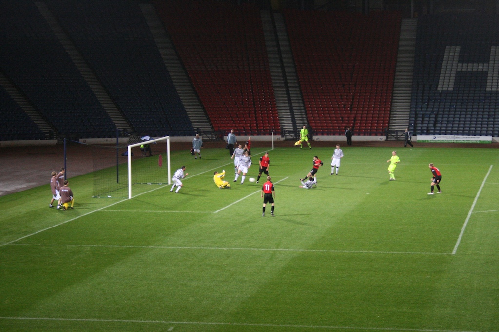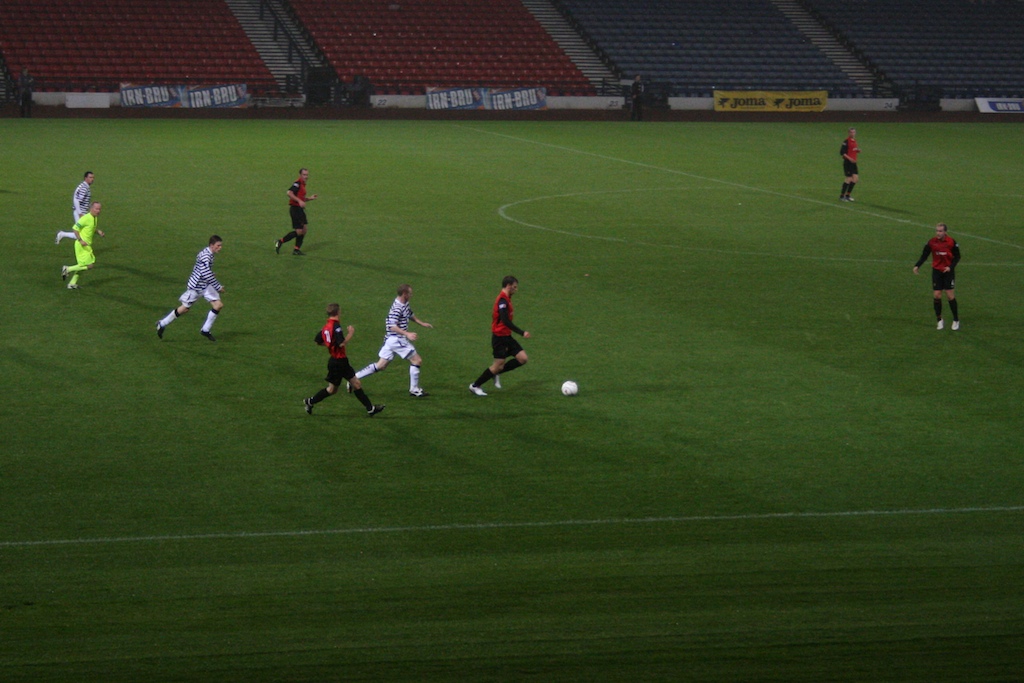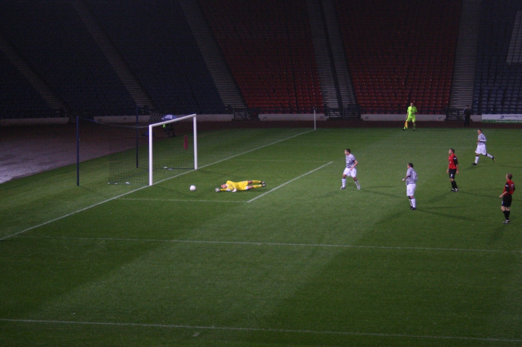 To be fair however, since 'New Hampden' was born it has produced some unforgettable football moments, none more so than Zidane's astonishing volley for Real Madrid in the 2002 European Cup Final. The only thing tonight's match had in common with that was the weather ' the rain finally arrived after our glorious 2 months of sunshine at the games. 376 brave punters turned up for Queens Park v Albion Rovers and it made for an eerie encounter as player's vocal encouragement to their teammates echoed round the stadium.
