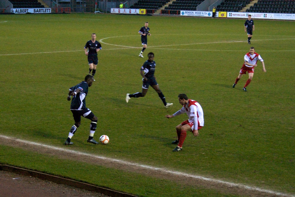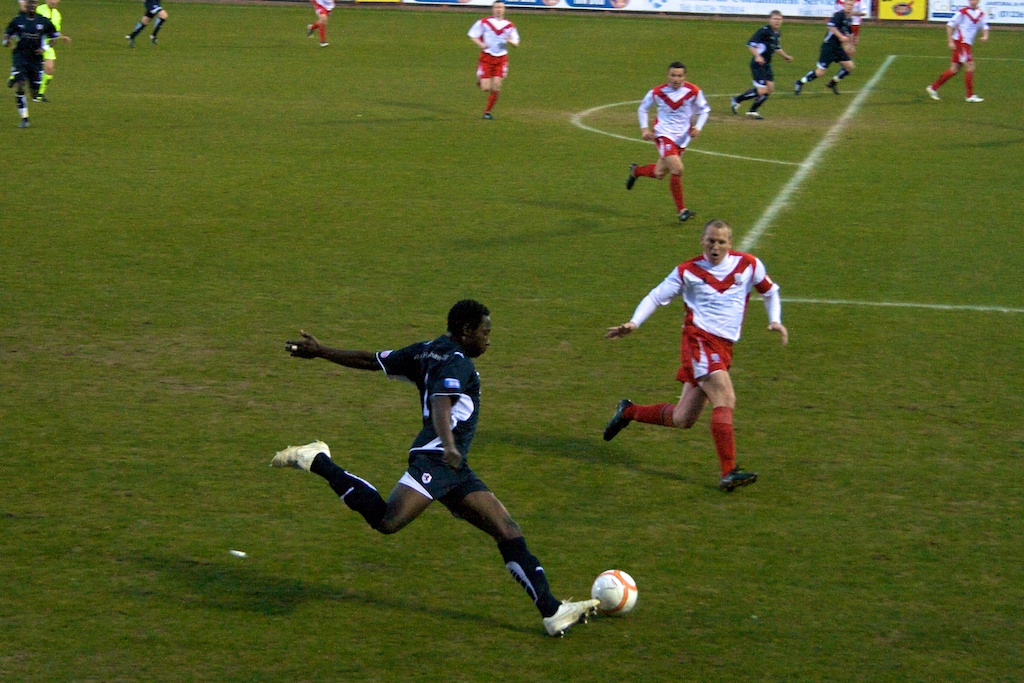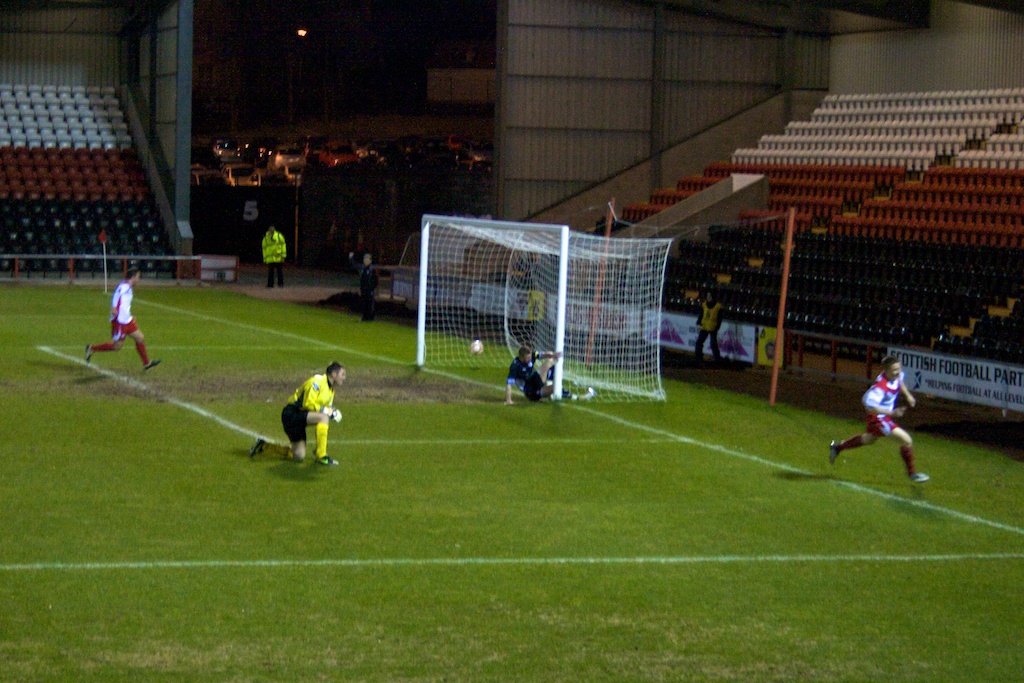 Airdrie found themselves one up after just five minutes when Thierry Gathuessi gave a corner away and from the resultant melee in the box John Baird swept the ball home. It was clear from the outset that Gathuessi, formerly of Hibs and Inverness Caley, was having one of those nights that would live long in the memory for all the wrong reasons. Continually losing possession, unable to complete basic passes and forever horribly out of position his night lasted all of half an hour by which point his own fans had turned on him and his manager had no choice but to take him off. To be fair to the lad Raith boss John McGlynn could’ve easily hooked any of his eleven on the park.