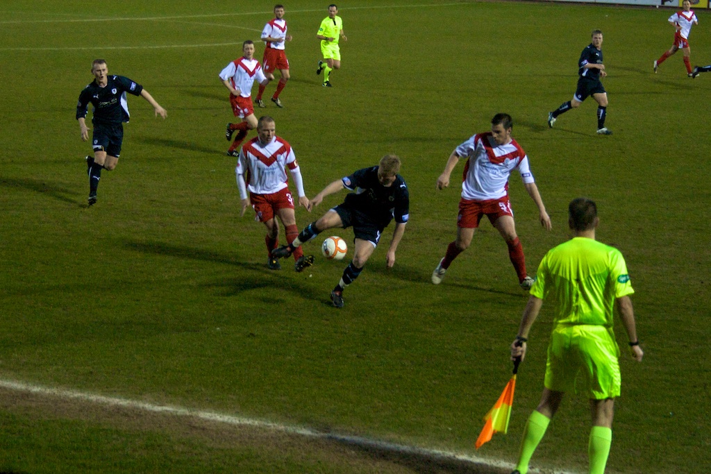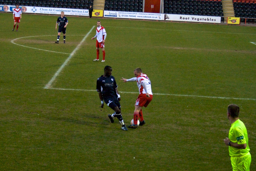 Our final midweek game and our most dangerous trip yet – deepest darkest North Lanarkshire for a 1st division relegation battle between Airdrie and Raith Rovers. Thanks to the horrendous winter Scotland had endured both sides were dealing with a fixture pile-up; Airdrie having played just two days earlier and Raith facing 5 games in 10 days. Indeed Raith were coming into the game on the back of a Scottish Cup semi-final tie against Dundee Utd at Hampden. It was only natural therefore to assume they may be a little hungover from their big day out but one wasn’t expecting them to so horrendously punch-drunk that they would put Oliver Reed at a free bar to shame.