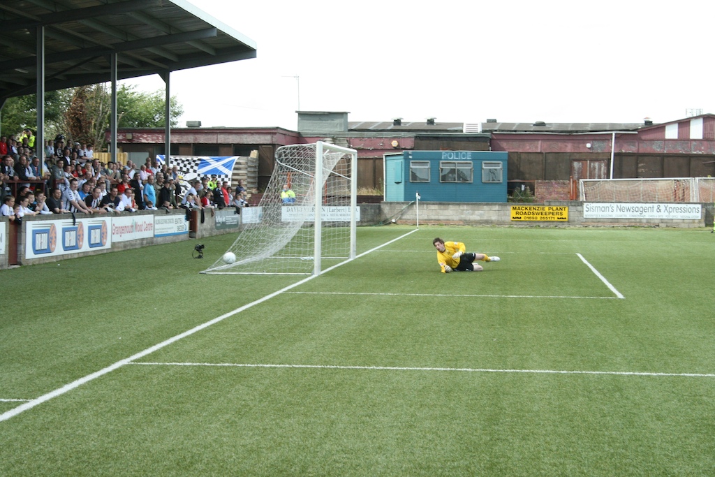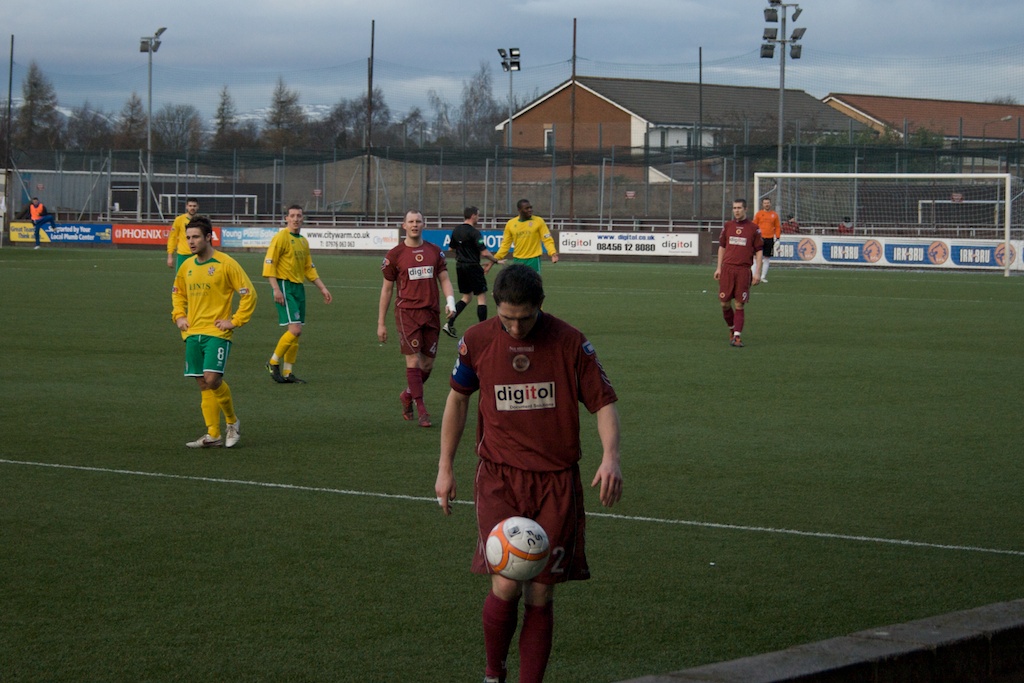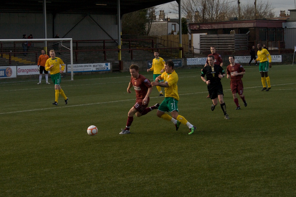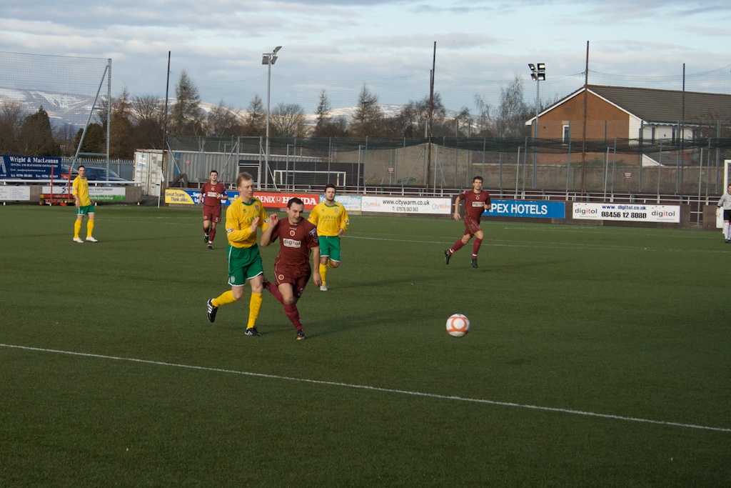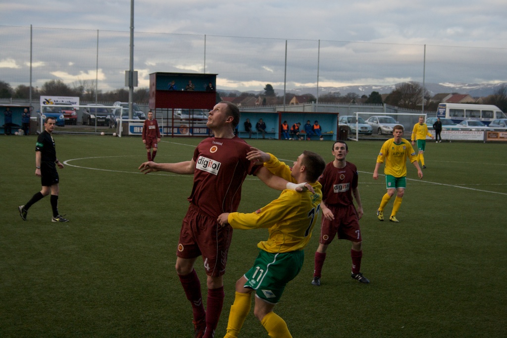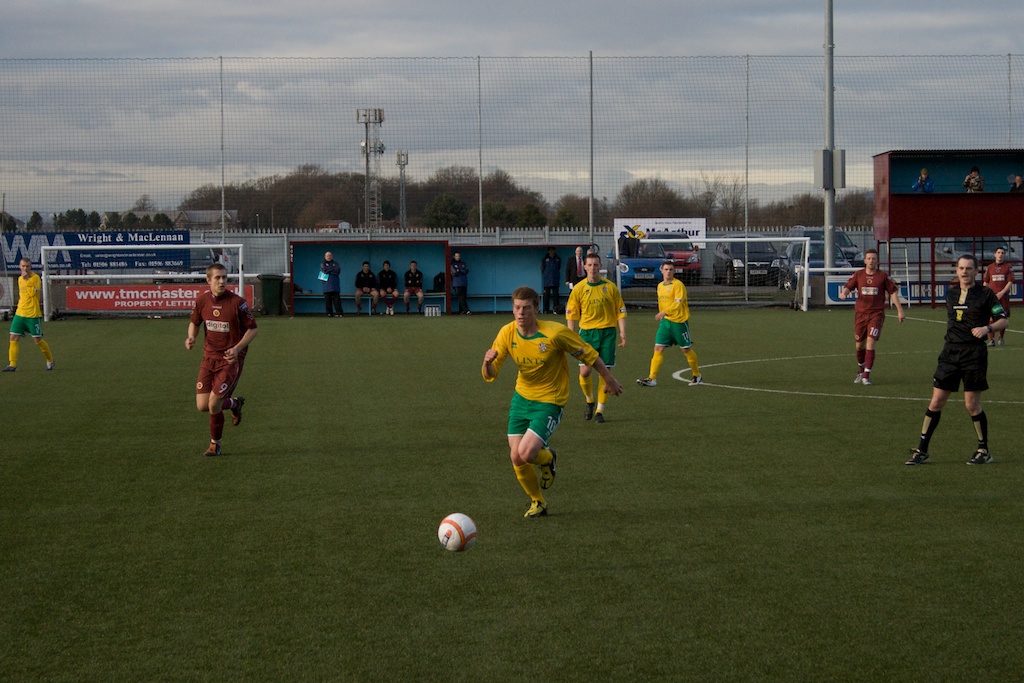 The match began at a good pace with Stenhousemuir pressing the away side hard but failing to create any real clear cut opportunities. Cowdenbeath did look more dangerous in attack but their forays forward were rare in occurrence, striker Gareth Wardlaw coming closest. The game turned in the Blue Brazil’s favour when Stenhousemuir’s Pat Scullion received a second booking just after the restart for reasons only known to the referee and linesman – presumably for abusive language (something with which the 400 or so punters berated the officials with for the remainder of the game). Cowdenbeath briefly threatened to utilise their numerical advantage and Stenny keeper Chris McLuskey pulled off a stunning save from a close-range Paul McQuade effort. Despite dominating possession they failed to create any further clear cut chances as the home side doggedly sat in and tried to hit on the break. Indeed they could've snatched an unlikely three points but their final ball let them down and when they did get a clear sight of goal they failed to properly test goalkeeper David Hay. With just seconds left on the clock Stenhousemuir's Paul Quinn found space and raced towards goal only to be cruelly chopped down by Kenneth Adamson. He deservedly saw red but the resultant free-kick sailed high and wide and that turned out to be the final action.